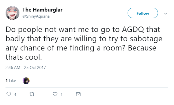 The rooming... What, do attendees house like 5+ people on the floors of their rooms? Is Chibi expecting to be provided an actual bed in a room someone else pays for? A more poignant question: why the fuck is GDQ a priority for him?!