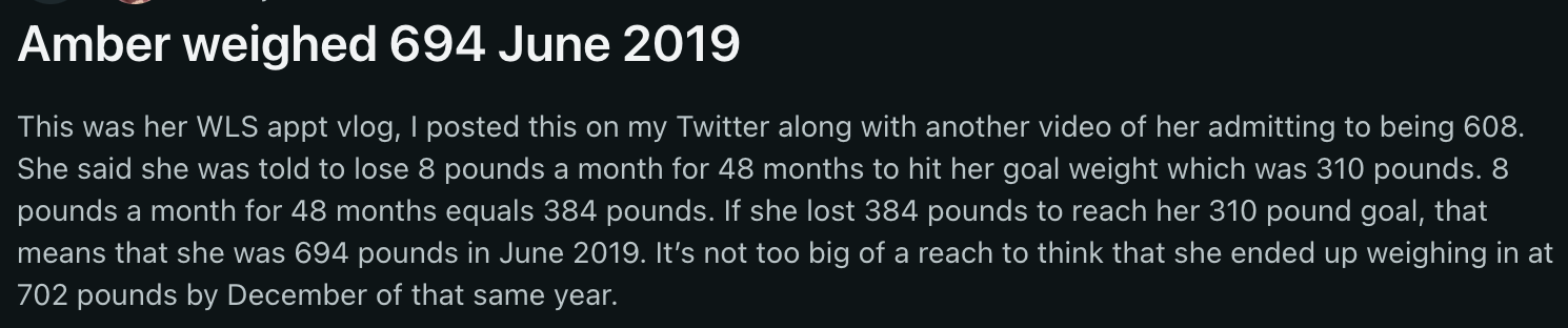 Not to mention how in that clip, she said “310 in 3-4 years” VS “600 in just a few months”. I’m sure she tried/would try to twist it to GAINEEN to 600 in just a few months, but it’s pretty clear here imo that the implication was either lose weight rapidly to GET DOWN TO 600lb in “just a couple months” thereby implying that she was WELL over the 600, I’d even say well over the 650 mark at this point, as opposed to her preferred method (of course) of losing the weight more slowly to get down to 310, but only in 4 years. We ALL know Amber ALWAYS picks the easier option, so it would only make sense that the first option would’ve been the harder one. So yeah, it all completely tracks with her being 694-702 in that time span.The 702 allegations were not on my 2025 bingo card. gonna archive the screenshot