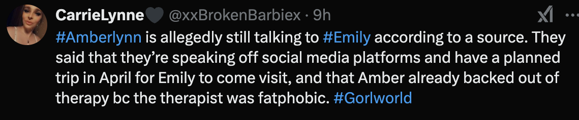 The part about Emily is plausible but not sure. I AM sure that the part about Amber abandoning therapy because "the therapist was fatfobic" isi know its just some bitch saying whatever the fuck but it doesn't sound far fetched