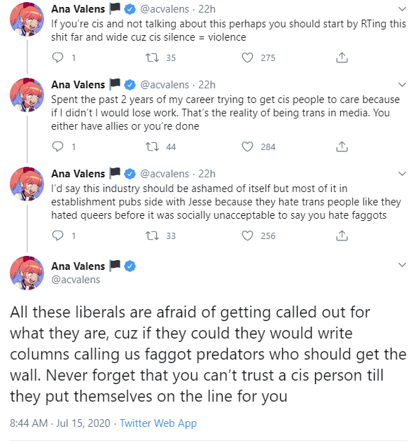 Me, too. I have been taken advantage of sexually and discriminated against based on my gender and sexuality. I have seen what happens first-hand to trans women who work in games, and it has only worsened my post-traumatic stress disorder. To date, I’ve only seen two incidents where this led to some sort of permanent change, and in both cases, it was not institutional change. It was merely the responsible party leaving the industry while everyone else patted themselves on the back.