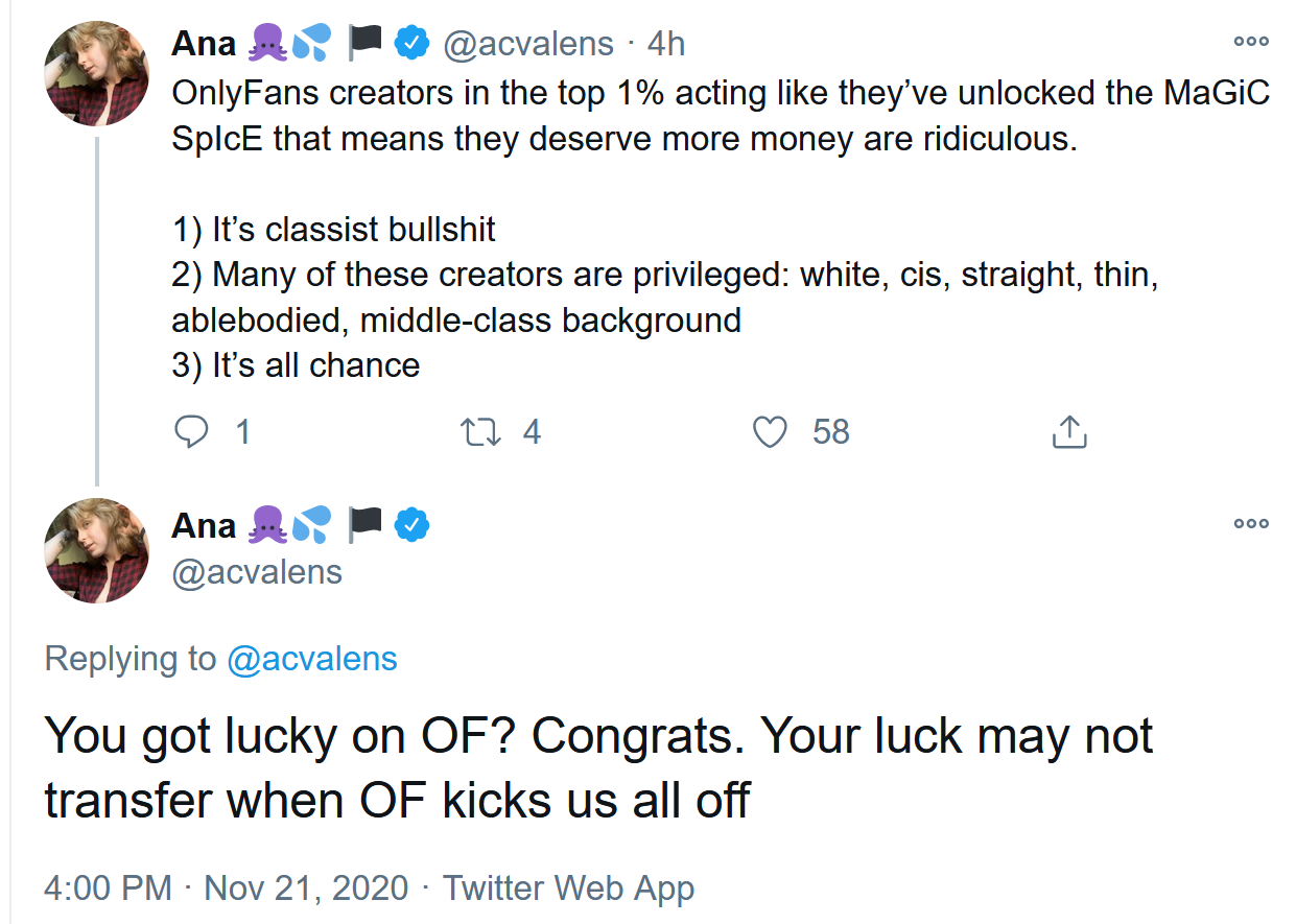 It's all self interest. You won't see Ana here talk about the girl who was violently raped and begged Pornhub to remove videos of her assault for years and only succeeded when she pretended to be a lawyer, or the Girls Do Porn shit where the women didn't get to keep their own contracts and were sometimes physically prevented from leaving the studio.
