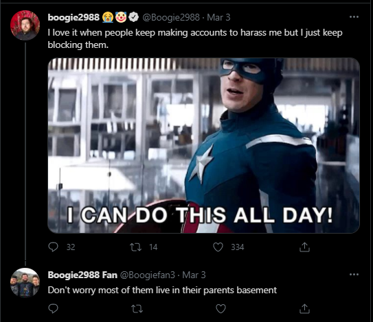What would compel the "Boogie Fan" account to go out of his way when writing his 4th ever Tweet to specifically single out the fact that he respects "fair criticism" offered to Boogie - I mean this is a fan account, right? Steven would love nothing more in the world than for his critics calling out his pedophilic, manipulative, and abusive tendencies to instead have a change of heart and instead only remain critical of irrelevant shit that does not matter. He'd kill Sammy tomorrow if it meant that rather than critics citing his desire for underage children, they instead focus all of their attention on "Hey Boogie, awesome video! I think your thumbnail could use some work though, maybe use a different font?".