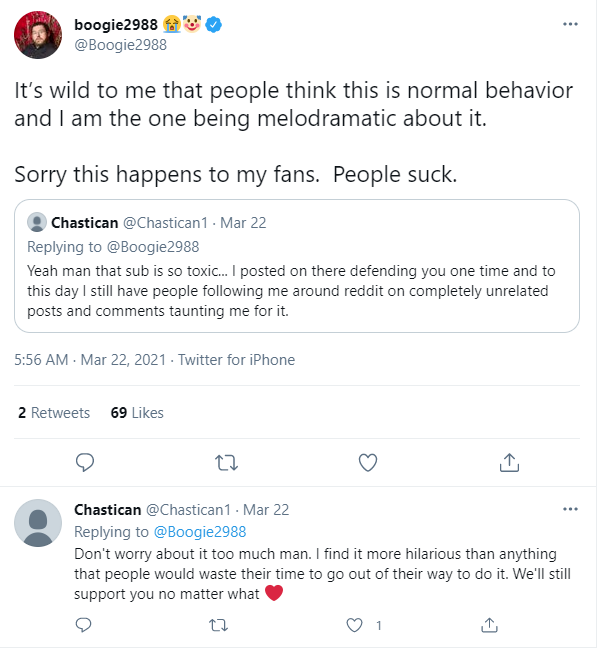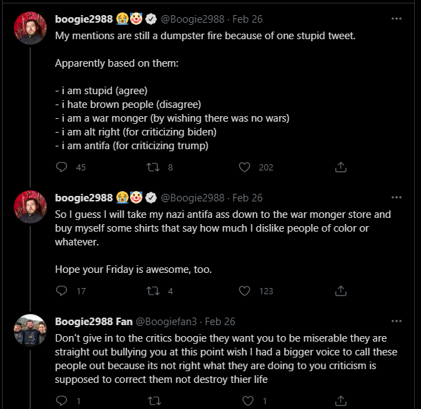 I interpret this as Boogie being a weak bitch who instead of firing back, he logs out of his account and chooses to reply with sympathy hoping it triggers others to do the same. BoogieFan3's last Tweet was 10 days before this, but he replies to this immediately after the crying Tweets. While a stretch, I truly think subconsciously his "I wish I had a bigger voice" comment can can be translated as "I wish I wasn't a pussy and need a sockpuppet to tell my real critics to shut the fuck up".
