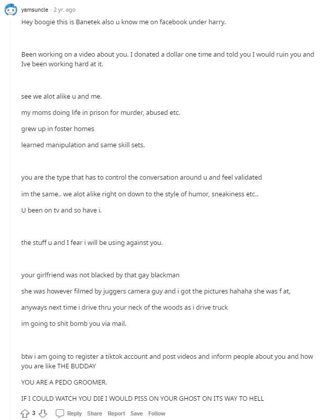 I don't actually know a lot of widespread rumors about Boogie. Here's one: when he went to a local BLM protest, he was chased out by people who recognized him as the guy who said "that's a lot of money, for a black person" on stream. Here's another that's hard to verify: someone who claimed to know Boogie IRL before he was famous claimed that during Boogie's only real job (working at a card game store) he'd take money from the cash registers and put it into his pockets because "he has to get paid".