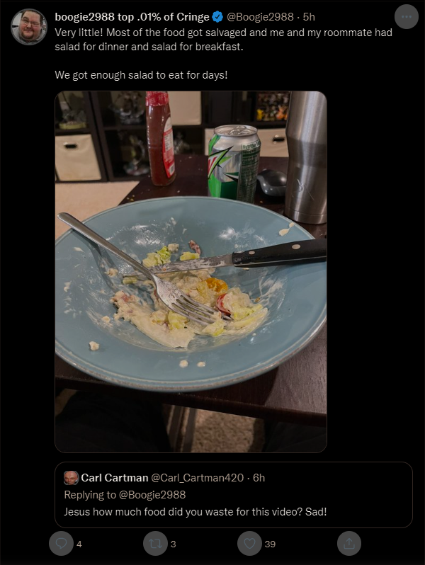 That latest video was disgusting in a bad way. I don't know who boogie thinks wants to watch him spit out food. It's not amusing, it's vomit inducing. Even the comments on his twitter post about it are just people saying they don't want to watch him eat and spit things out. The funny thing is the "coming up..." clip at the beginning that's supposed to entice you to stay probably ran the majority of people off, because it's him just spewing out ranch and mtn dew as it drips down his beard. You just know he thought that was peak comedy too.