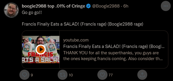 Francis used to be short videos, "I'm upset about X, let me scream and flip out for 5 minutes and then maybe smash something." In the length of time I watched for this one, I'd expect screaming and things being thrown around, smash some vegetables. Nope, got him eating like one berry in all that time. It's a fucking mukbang and in 2 minutes he eats one fucking tomato or something. Its the same as his last Mukbang where he ate 2 scoops of ice-cream and a child's size bag of cheetos claiming his "stomach is still too small". He beat the surgery years ago now, his stomach will have regrown by quite a lot by this size. Does he really think at this point people will be upset if he eats too much salad too quickly or something?