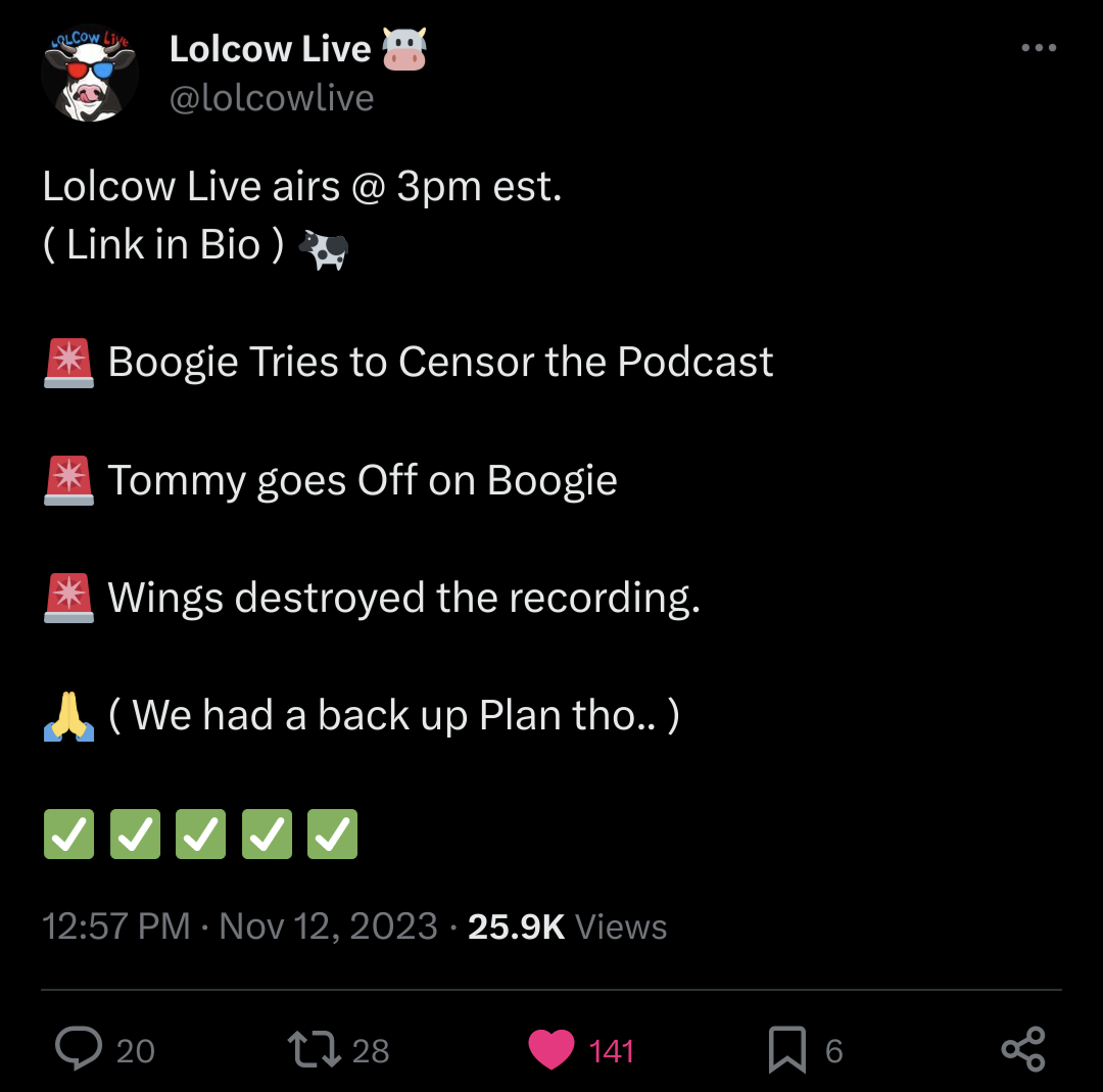 I'm cautious about being optimistic about the lolcow podcast. If it's just scripted garbage then what's the point. Boogie is only entertaining when he has relatively little control over the content of a podcast, because he is not a funny person, only funny to laugh at when pushed into a corner.This shit's so scripted, man. Wings even said as much on his stream a few days ago.