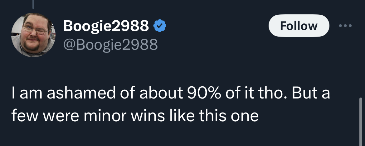 I've learned that a lot of Boogie's behavior is multifaceted. He can't not be a saint, even when purchasing prostitutes, so he has to talk about how good of a guy he is, but he's also trying to cover up the very obvious fact that he is a 50 year old serial sexually harassing pervert creeping on teens online to such an extent he travels out of state to see his hookers. He's just a Chad doing nice things, not a dirty old man exploiting poor 19 year olds in fucked up situations, don't you idiots understand?