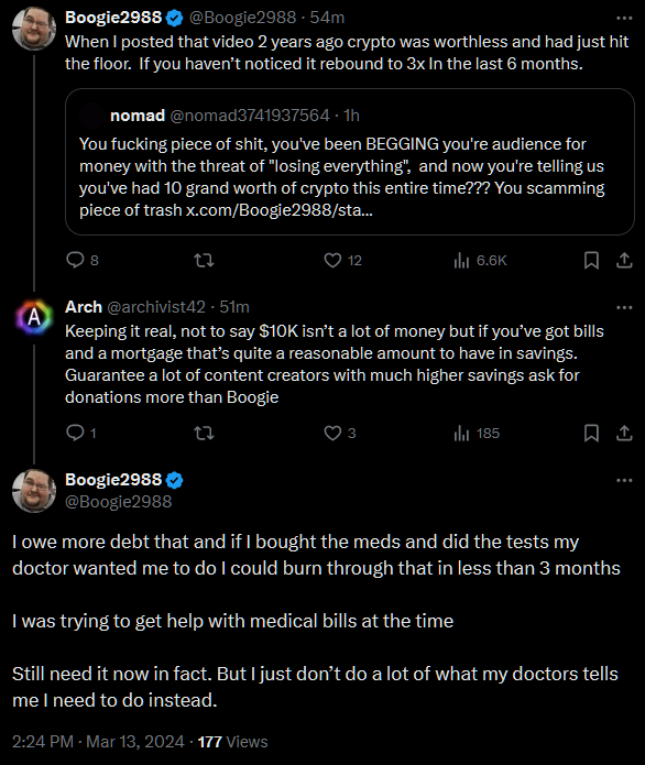 Someone responds to Boogie pointing out that he's rewriting history. Boogie again rewrites history by lying about the proximity of time elapsed between his begging video and cancer video: