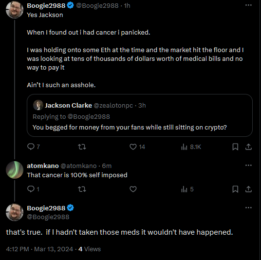 Holy SHIT is he on a Twitter tear right now, Jackson from the Ordinary podcast getting into it with him as well! Busting out all kinds of Boogie moves, accusing Jackson of being a millionaire pissing down on him for having cancer, rewriting a bunch of history, all kinds of filibustering.