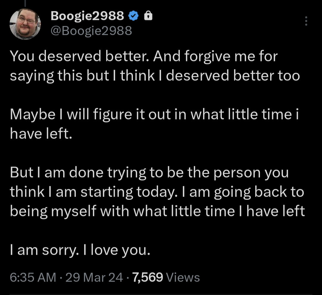 I assume Dezi left him? So this is pretty funny. Really funny actually. One of Boogie's tactics with Dezi was to babysit her. She's not allowed out of his sight and she had to go everywhere with him. I'll gladly accept any examples of when Dezi has not been with Boogie since the "My Girlfriend Moved in" video from July last year. I won't get any responses because no one can provide examples. Boogie has had Dezi on the tightest leash since she moved in. I've never seen him travel anywhere without her. Boogie has been really careful with this one.Boogie is having a mental breakdown because his "gf"'s payments are up, her parents came and nabbed her so she can start school soon with all of Boogies money, so now he's having a meltdown trying to get her attention but can't admit she left him or we'd all laugh at him. So hes doing this shit to get her to message him and trying to open up communication to try and manipulate her back.