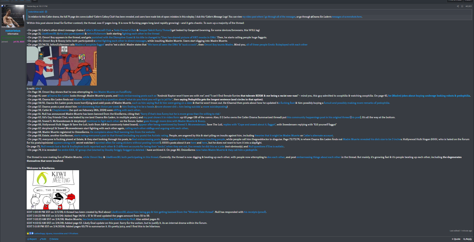 -On page 70, everyone is fucking pissed at Estate, & they start looking through his posts, to find embarrassing posts. Estate appears in the thread and starts insulting people, while people call him thegooddoctor in disguise. Page 72/73/74, is where @Osama Bin Laden finds out Madre Muerte revealed his dick size to be 3 inches. Hollywood Hulk Hogan (HHH, who is hated on the forum for his posts/opinions) appears along with @secret watcher (reported often for using stickers without posting himself). HHH's posts about it are here and here, but he does not want to turn it into a slapfight.