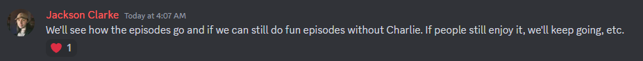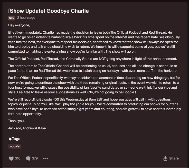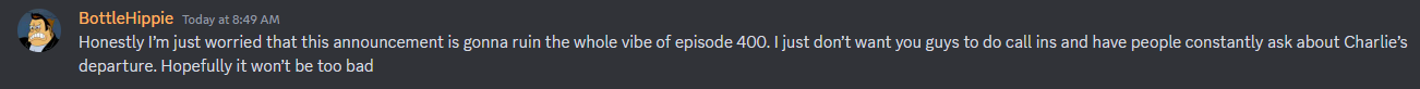 The whole episode will be ass considering all the shit Charlie did, the whole atmosphere will be weird considering the guy left and the calls won't be funny.Official Podcast Discord Update.