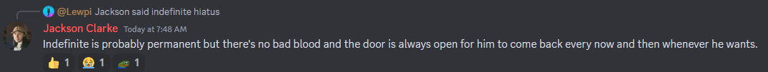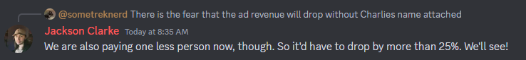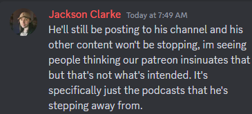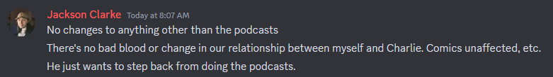 So other than being a faggot who just got his first taste of backlash, is there any reason to fully step away from the podcasts? All I seen was Red Thread, Jackson seems very liberal so I don't think he would have gotten offended and even Wendigoon who is more conservative leaning would probably be too polite to openly challenge Charlie either. Is there anyone on the official podcast that would give Charlie shit for the debate?Official Podcast Discord Update.
