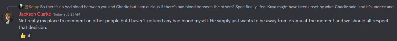 Very possibly Kaya, but Jackson denied there being any fight between them, though obviously that could be a lie.Is there anyone on the official podcast that would give Charlie shit for the debate?