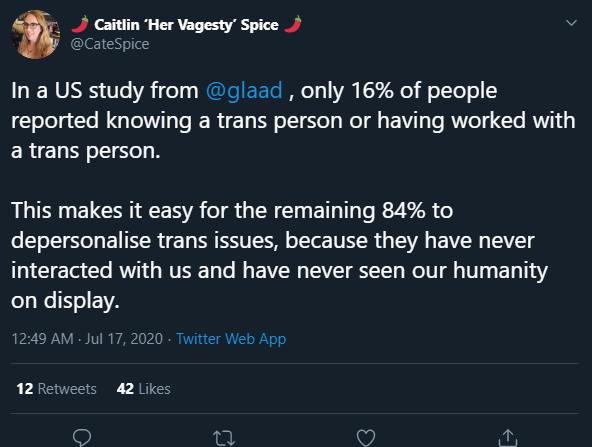 Are there enough transgenders in the world for every single person in the US to have interacted with them? I have only known one (but he was schizophrenic and stopped being trans once he got diagnosed and medicated -- so I don't know if he counts in Dan's eyes as "true trans".) I've seen a couple around town, but I have never worked with or hung out socially with anyone who is trans. Never. Not even at school functions or PTA meetings or any place where I couldn't avoid it.View attachment 1453117