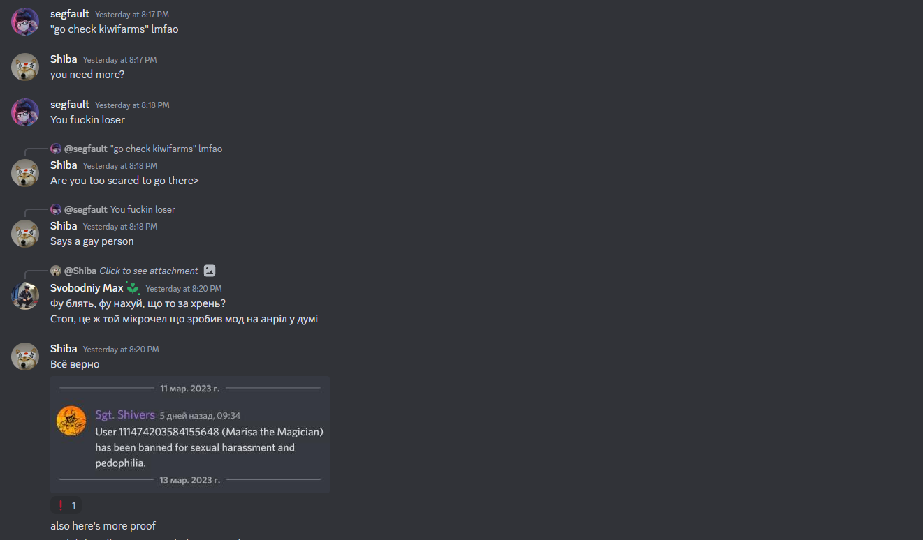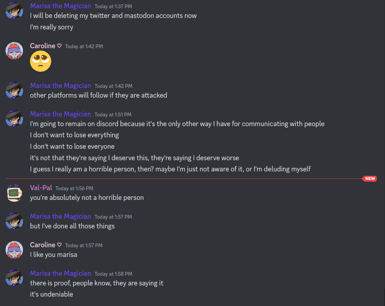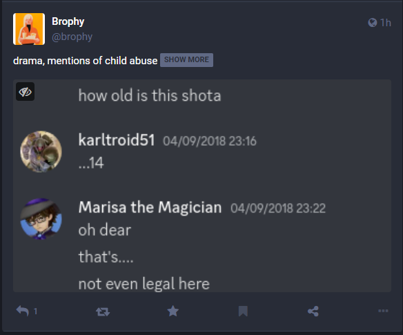 I didn't know that Ikol was banned temporarily. We got what we need and I think that's most of the things there since you linked IKOL's reply, that's exactly the screenshot Marisa posted. Thankfully Mastodon doesn't delete individual replies to threads.Ikol? Oh... Oh hold on, I actually do know this guy and his discord!