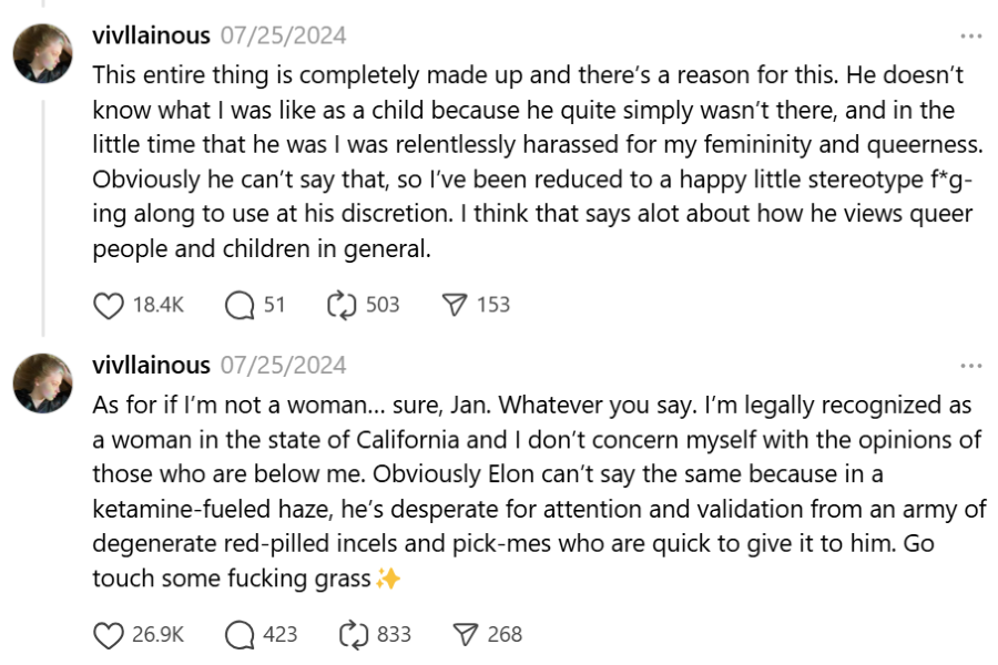 > Vivian Jenna Wilson (formerly Xavier Alexander Musk)Wasn’t his tranny kid named Xavier but changed it to Vivienne?