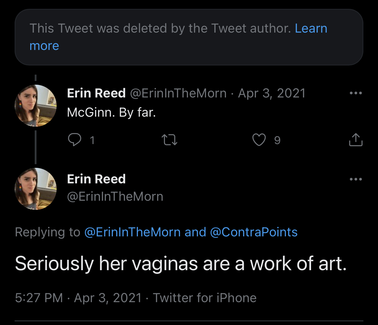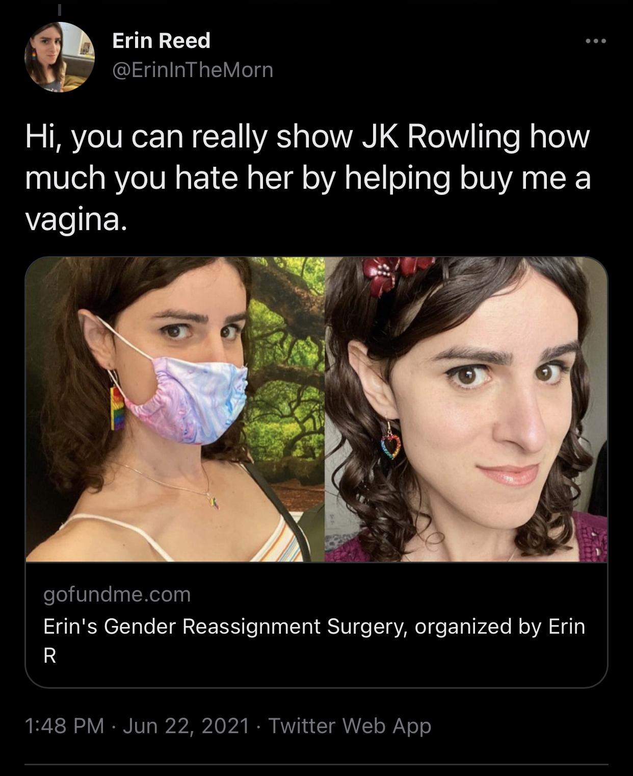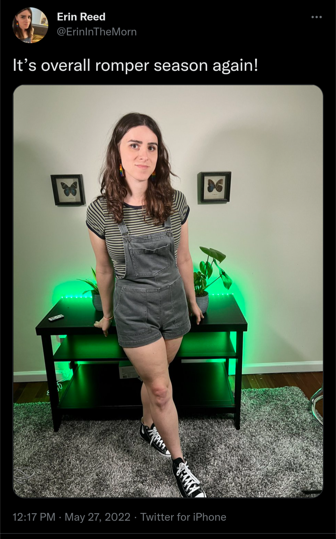 Erin Reed / Anthony Reed II / @ErinInTheMorn / @ErinInTheMorning / @ErinInTheNight / _supernovasky_ / beholderseye / realitybias / AnonymousRabbit - post-op transbian Twitter/TikTok "activist" with bad fashion, giant Reddit tattoo. Former drug dealer with felony. Married to Zooey Simone Zephyr / Zachary Todd Raasch.