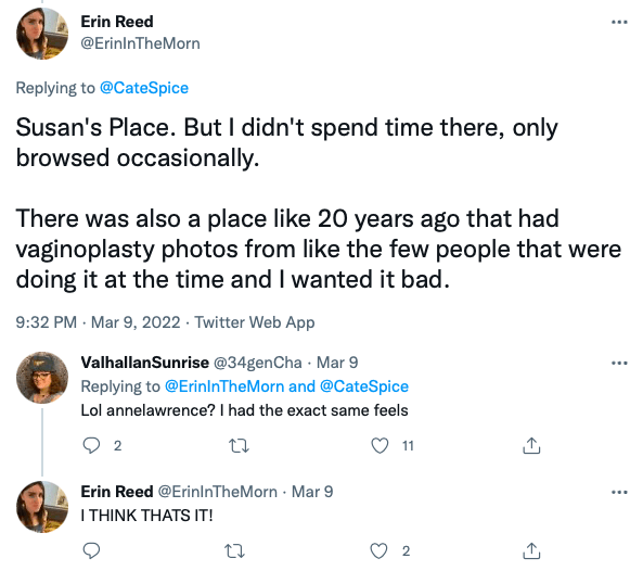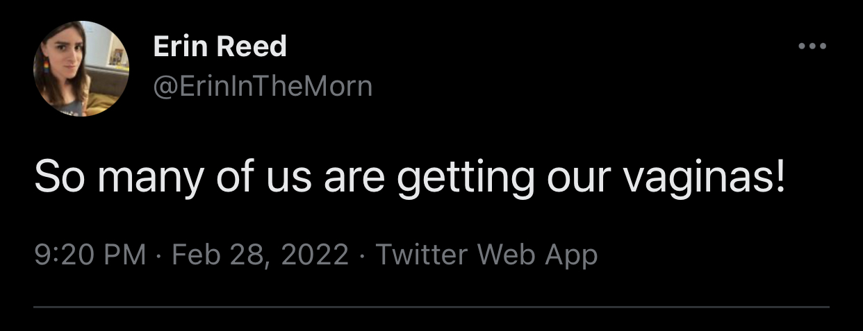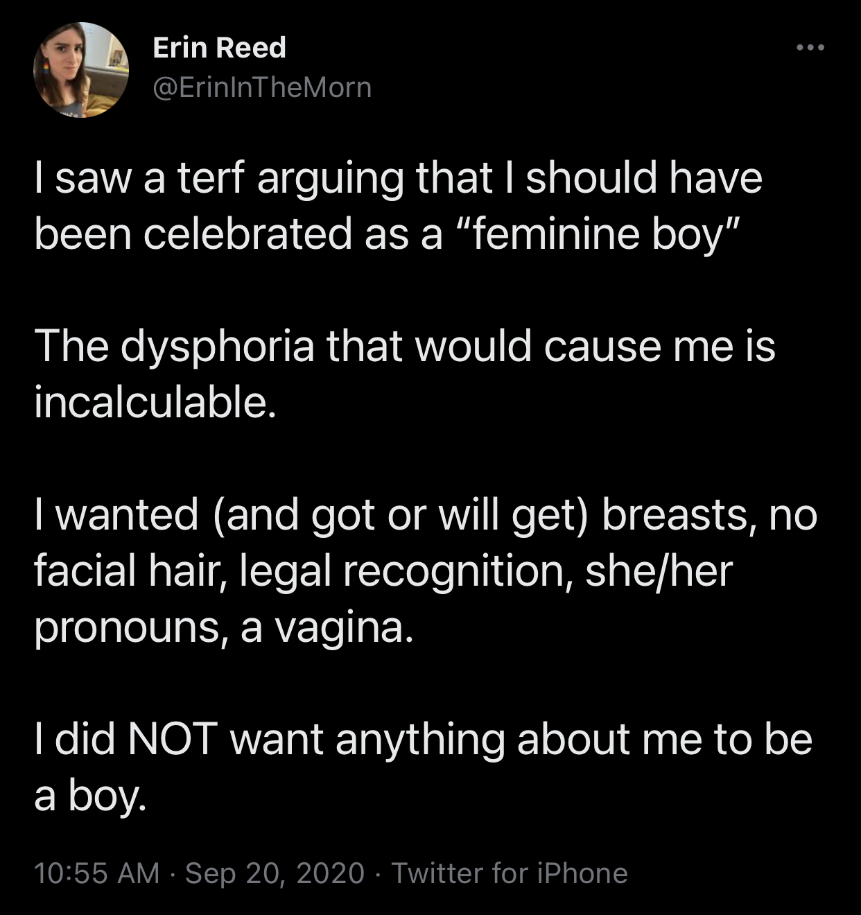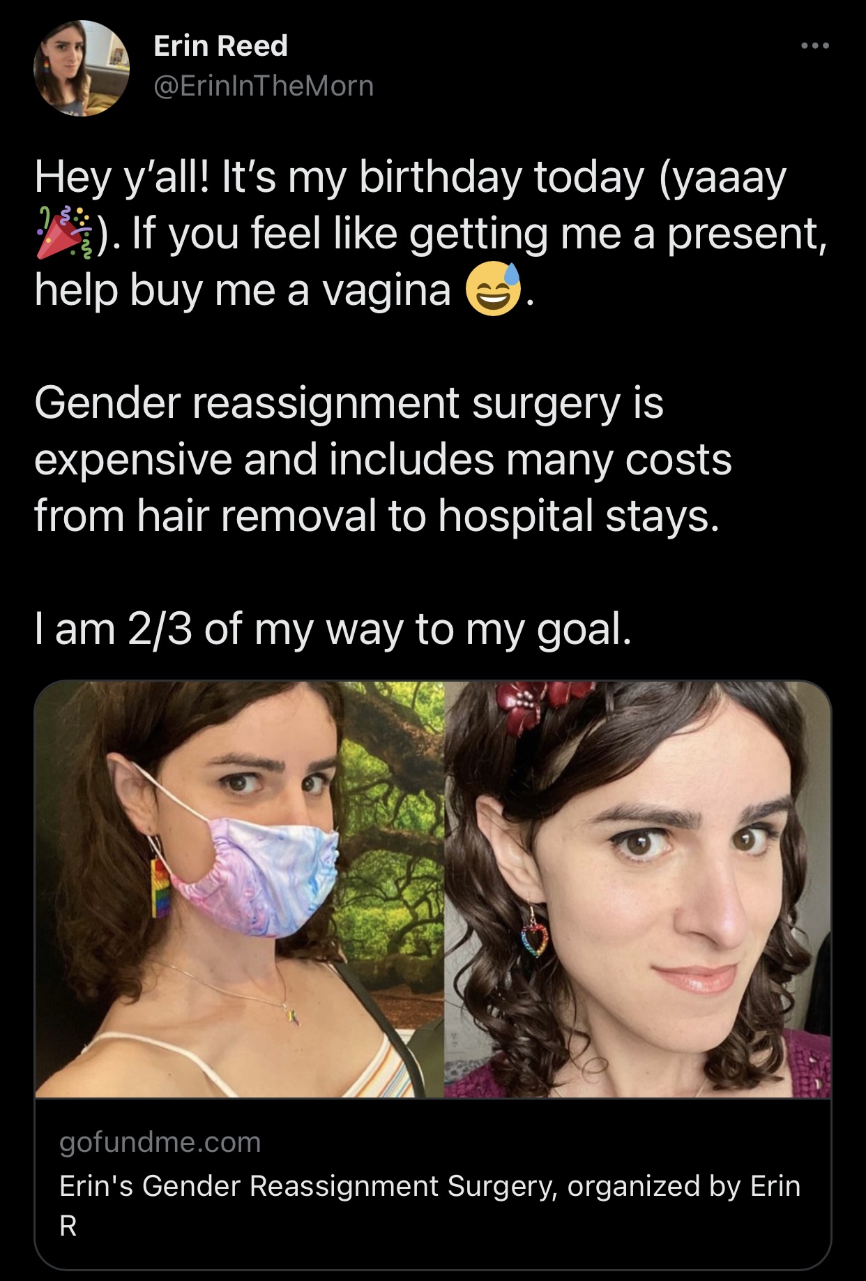 Erin Reed / Anthony Reed II / @ErinInTheMorn / @ErinInTheMorning / @ErinInTheNight / _supernovasky_ / beholderseye / realitybias / AnonymousRabbit - post-op transbian Twitter/TikTok "activist" with bad fashion, giant Reddit tattoo. Former drug dealer with felony. Married to Zooey Simone Zephyr / Zachary Todd Raasch.
