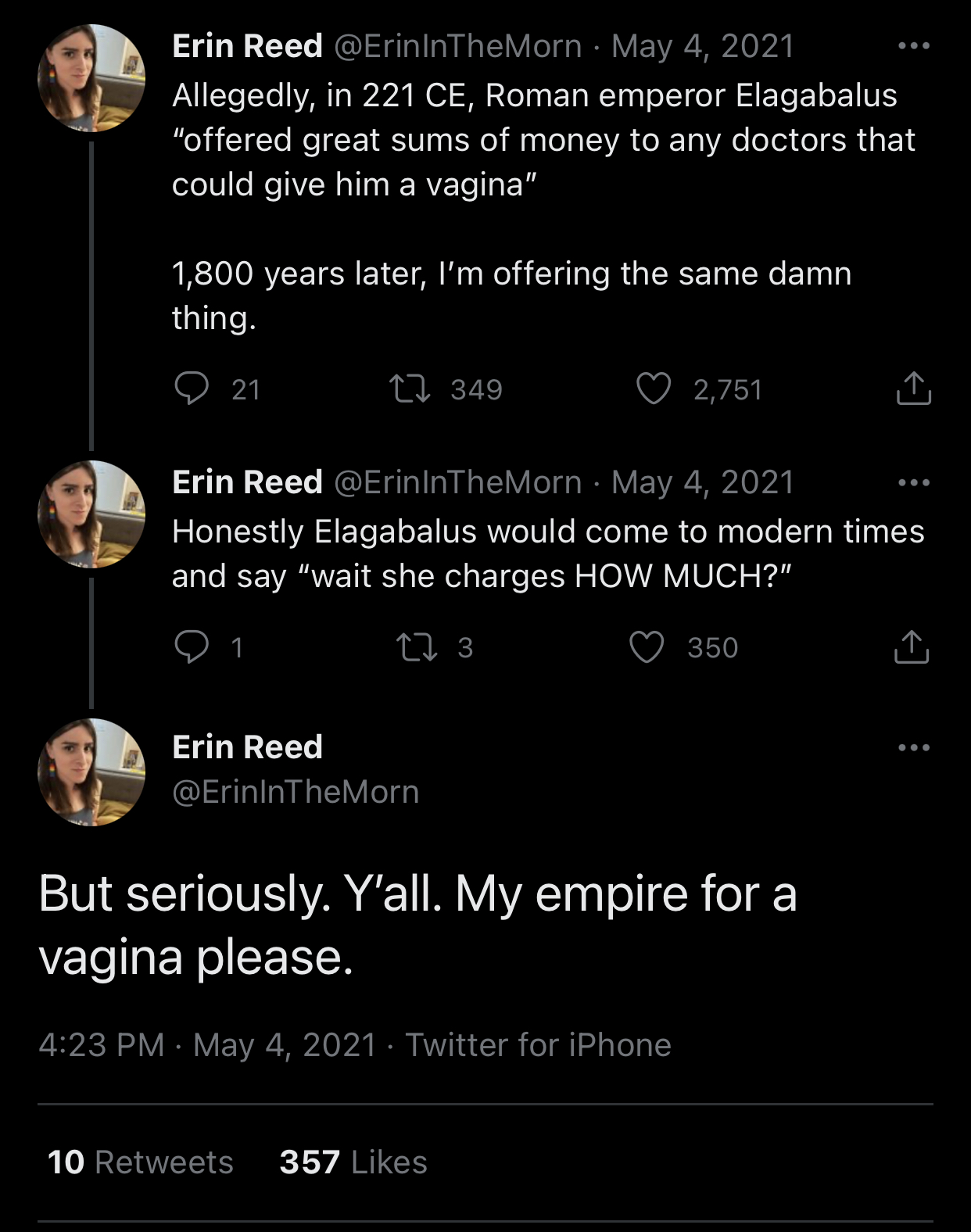 his Elagabalus tweets would have instantly peaked me if I wasn’t there already. Really they encapsulate his view on women: collections of body parts to be purchased and skinwalked by men who fetishize them.