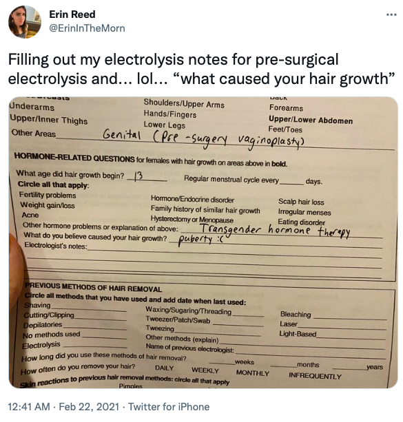He wasn't even supposed to fill that out. It's only for areas that are uncommon for women ( marked in bold). Does he not realize puberty gives women pubic hair ? This just screams give me attention I'm such a victim of " wrong puberty