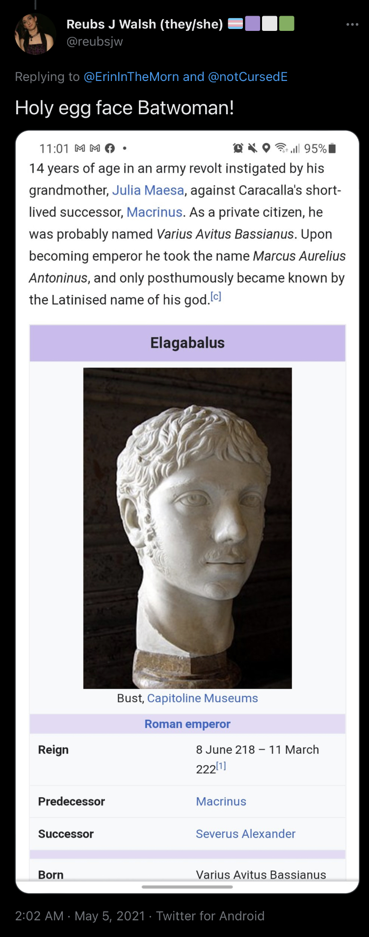 In true Tony style, his research seems to have consisted entirely of reading "7 amazing facts you never knew about the trans Roman emperor 🧵 👇".