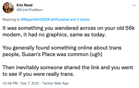 There was definitively trans stuff on the internet, most well-known probably Susan's Place (estb. 1995 and the origin of "hon"), Danielle Bunten Berry (creator of MULE and ultimately warned against transition), this charming website for "Sissy Maids" etc.