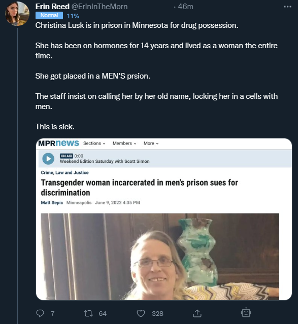 Erin Reed / Anthony Reed II / @ErinInTheMorn / @ErinInTheMorning / @ErinInTheNight / _supernovasky_ / beholderseye / realitybias / AnonymousRabbit - post-op transbian Twitter/TikTok "activist" with bad fashion, giant Reddit tattoo. Former drug dealer with felony. Married to Zooey Simone Zephyr / Zachary Todd Raasch.