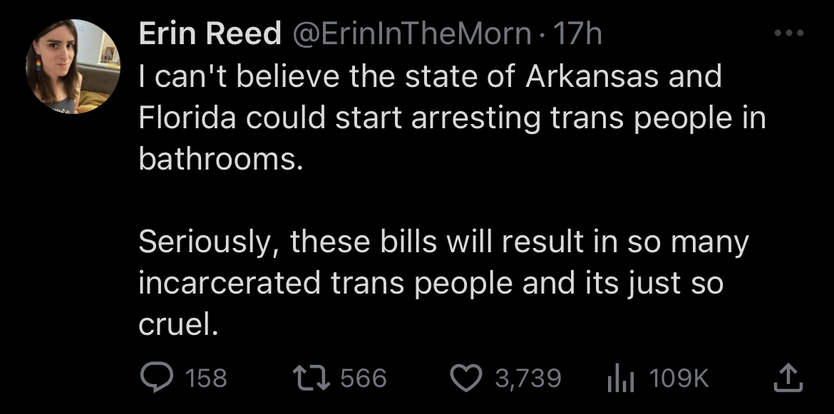 I think Erin Reed just expects a swarm of fascist descending upon them as soon as they step out of line, or the citizens of the fascist state being trained and brainwashed into hounding them and ratting them out for the base act of calling themselves woman that as soon as someone clocked them walking to a bathroom they'd end up getting a "Do Not Pass Go Do Not Collect 200$ Patreon dollars" straight to jail type deal. Then to be held there for a prolonged amount of time, abused by prisoners and guards (as that would fit into his trans martyr fantasy), the state finally funding the troon gas chambers or worse, forcibly detransitioning them so they can't be superior wahmen anymore.