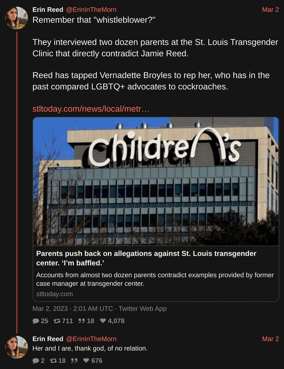 What interests me is the coverage so far focuses on Jamie Reed's credibility, which is largely the line Tony has taken. Tony's "debunking" Substack was shoot-the-messenger type stuff, coupled with claims that, effectively, "this can't possibly be true because gender medicine is excellent".