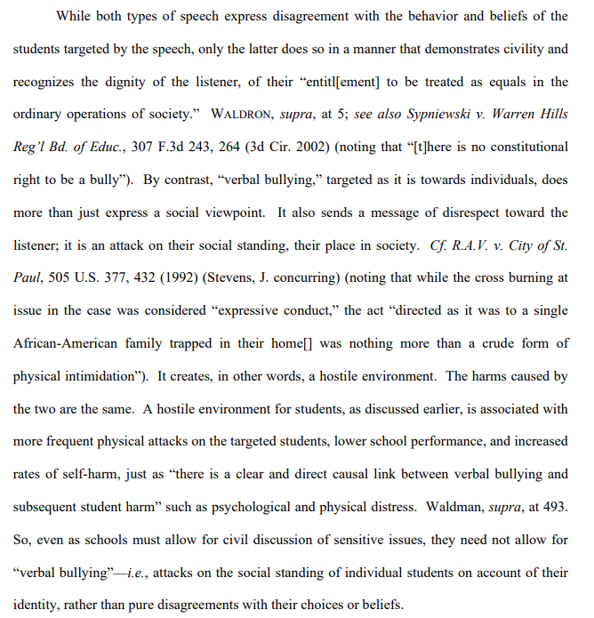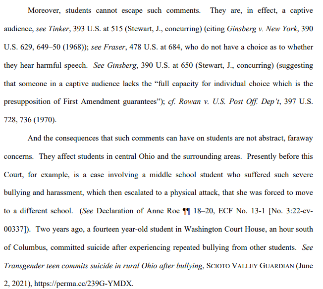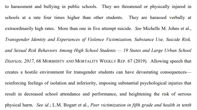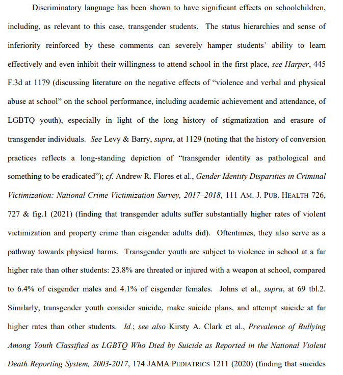 Transgender students are so harmed by people not using that pronouns that a student in a different district killed themselves in the past: