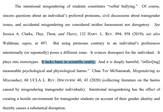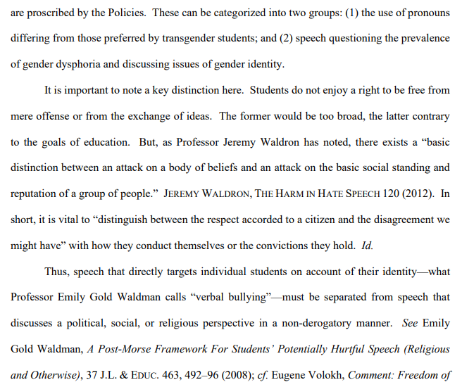 The judge thinks hate speech is a thing in United States law and that denying a claimed gender is an attack on their social standing: