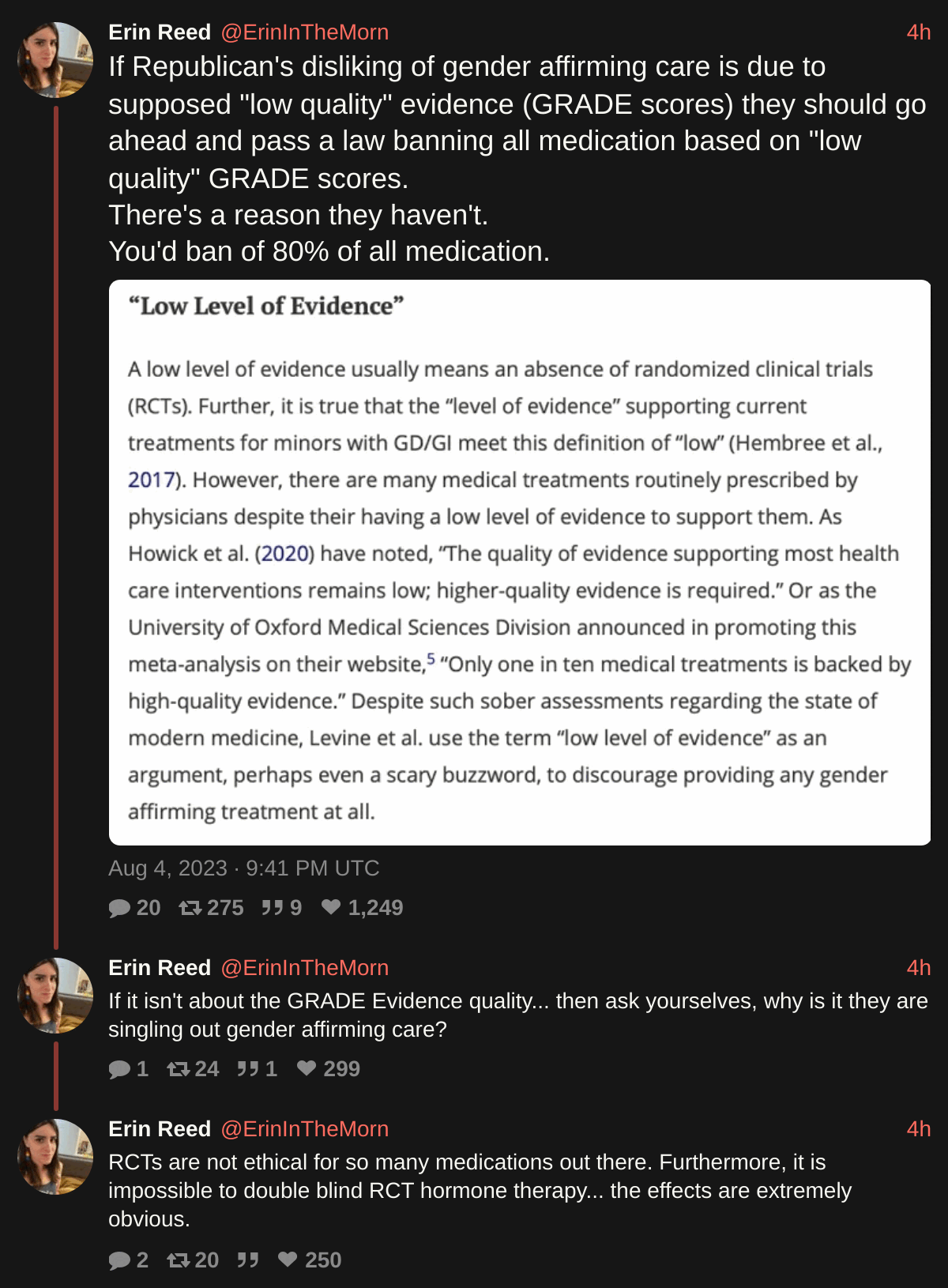 If Republican's disliking of gender affirming care is due to supposed "low quality" evidence (GRADE scores) they should go ahead and pass a law banning all medication based on "low quality" GRADE scores.