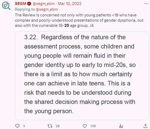 What's more interesting, though, is that he just refers off-hand to the "New York Time's recent article" without saying what it is — a report that the American Academy of Pediatrics has commissioned a systematic review of the evidence for "gender-affirming care". This follows pressure from SEGM.