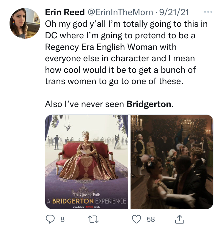 Expectation: a bunch of trans women in DC are going to dress up in cool period costume and go to a Bridgerton ball together in order to show up all those cis bitches who think they can have a female-heavy space that doesn’t center males!
