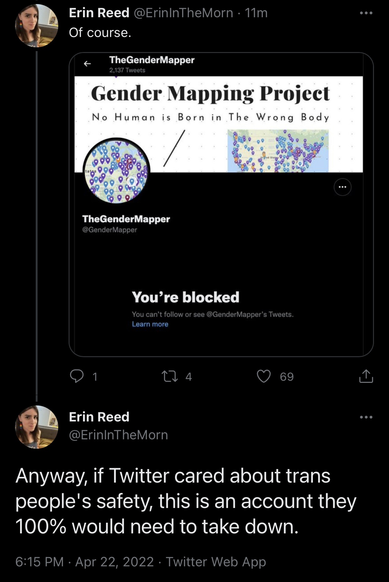 Should Twitter ban you for posting the map in the first place? You realize the genocidal TERFs are still going to be able to see it even if you got this account banned for "trans people's safety" right?