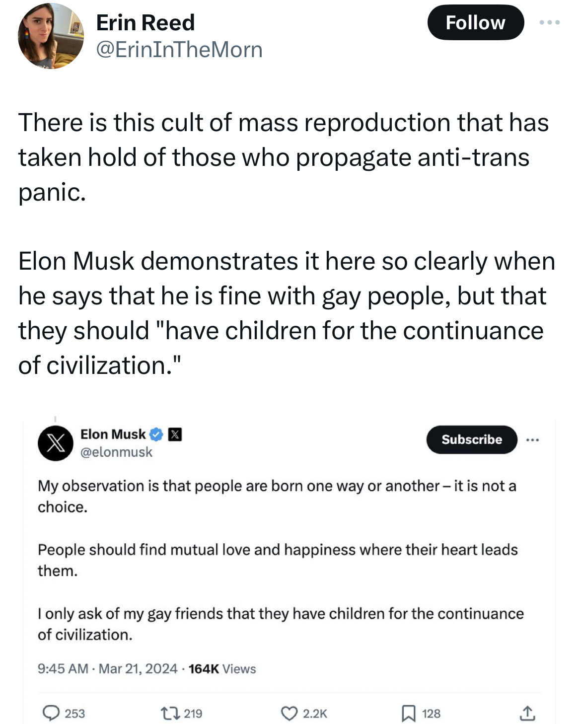 Lol. How much misinformation is too much, Ben? At what point do you decide that the guy who lies and misrepresents for a living has lied and misrepresented one time too many?@benryanwriter March 21, 2024 10:25 PM UTC: Just remember, Erin, if you want to keep posting these fact checks in my threads, you're going to have to ensure that you stop saying false things about my tweets, as you did yesterday and as you have many times before. One more false claim from you about anything I've said and I will have to block you.