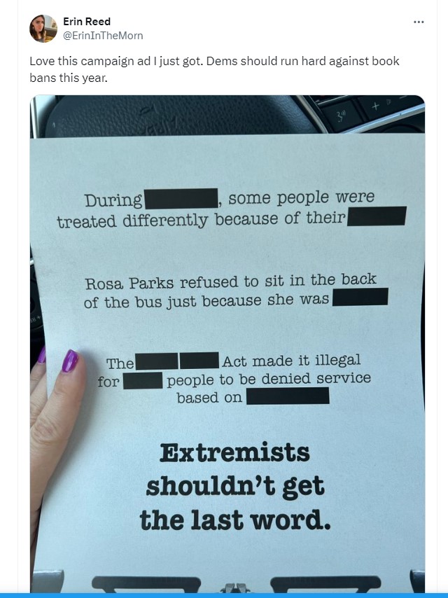 Running on book bans is a terrible idea. The Republicans would simply run ads that contain the content of the books in question, on tv that would look like reading the book with lots of beeps because of fcc rules.