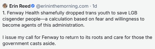 Hey Tony, here’s an angle you could have used that makes you look less like a selfish prick: “LGB people are being held hostage in order to advance the government’s anti-trans agenda. Fenway Health was forced to make the difficult choice between acquiescing to the current administration’s demands and losing their funding.”