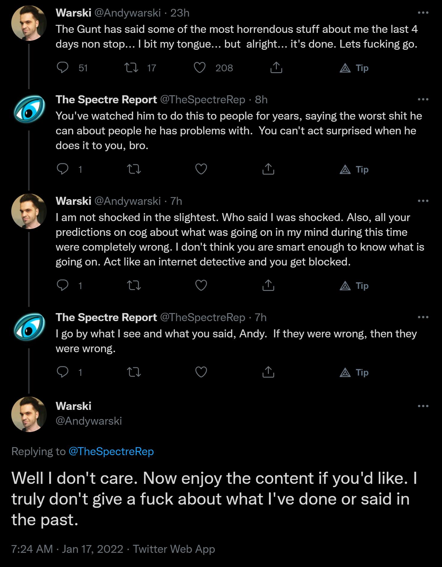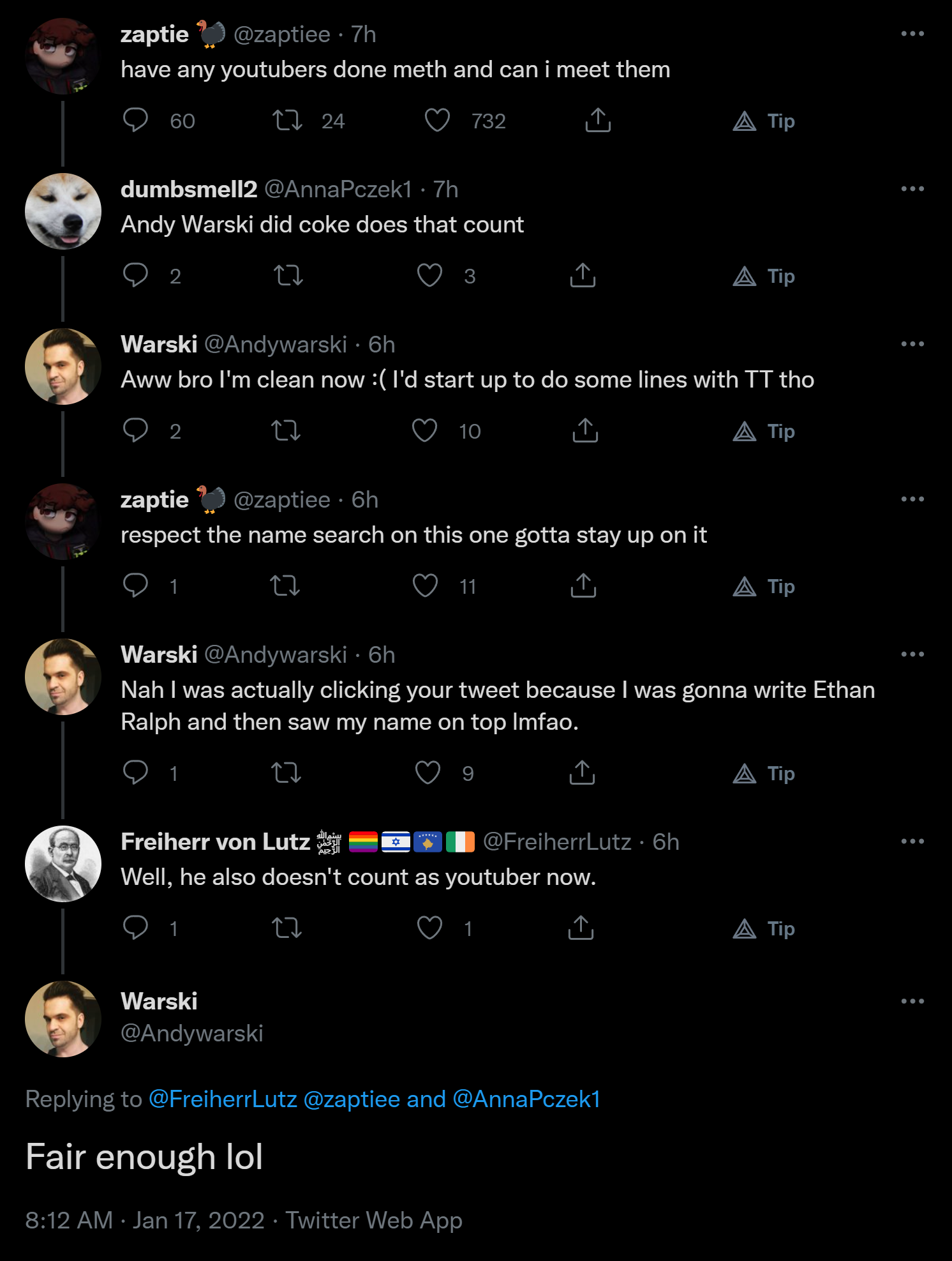 ralph constantly produces and i enjoy him and i hate warski the snake abortionist stuttering crybaby. ralph shit himself on stream but at 37 years old having your father put you to bed during a live stream is absolutely one of the saddest things our society has produced. people like him should be outcast. andy should be sitting on a pile of bitcoin instead he snorted all of his adsense money, then he flew off the handle. you get close to the sun you get burned.