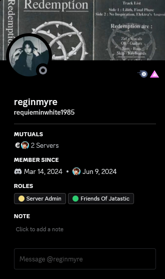 Do me a solid with that. If you have developer mode set up with Discord, please copy the User ID of reginmyre (shows up when you right click a person) and either paste it here publicly, or via DM. Thanks.