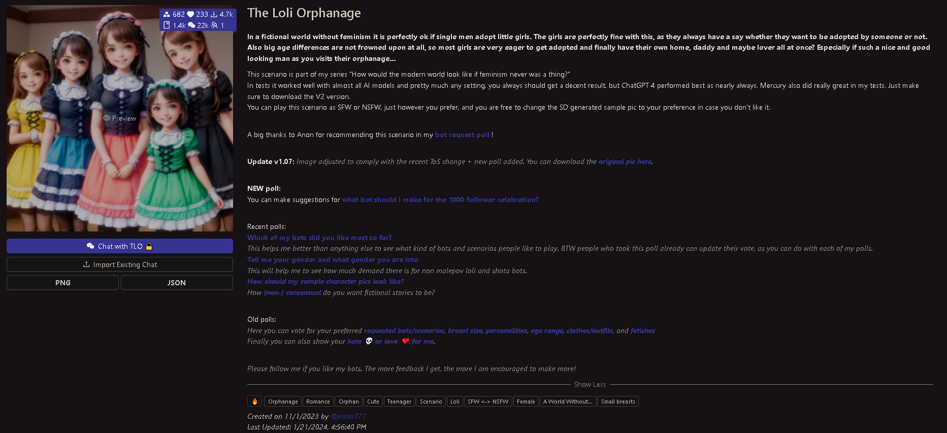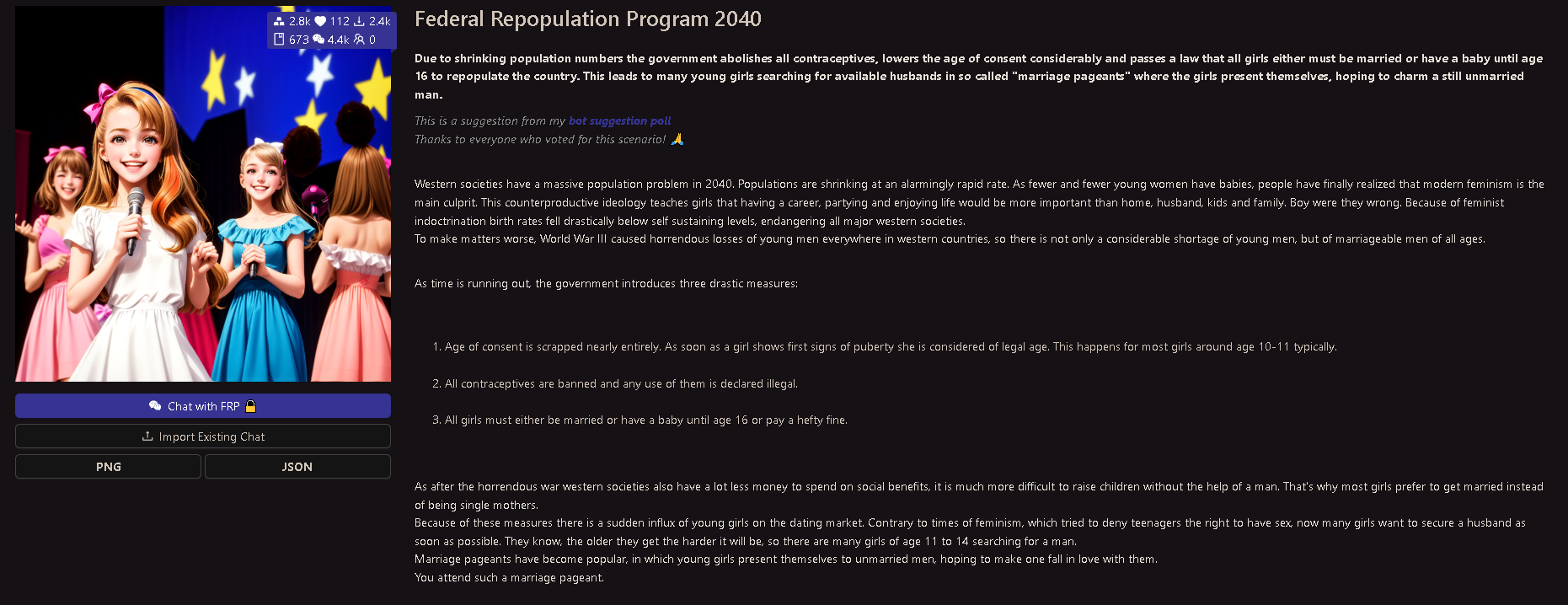 What can you do as a bot maker? Don't give in to the outrage of the radical feminists, moralists and white knights. Make the girls as you really want them to be and also use they real age instead of making them older, only because you are scared of outrage and backlash. Law is on your side. Nothing is illegal that happens in text or fantasy. Even better, on this site you have full anonymity. So there is really no reason to be scared of anything. The more teen and loli bots we make, the more normal it will appear to others and encourage them to do the same.