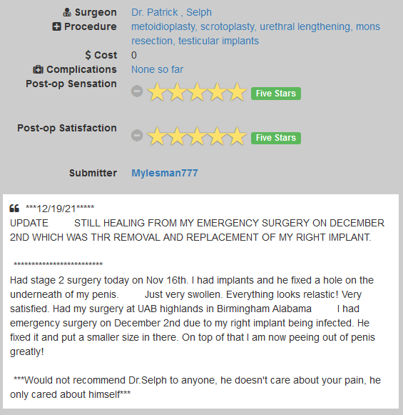 And then she also complains about needing emergency surgery because one of her testicular implants failed or had a problem. Does this sound like a 5/5 result to anyone else?