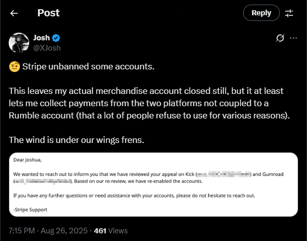 I was unbanned by Stripe on the Kick and Gumroad integrations. Kick subs for sure work, I just checked. I think Gumroad should also work now.