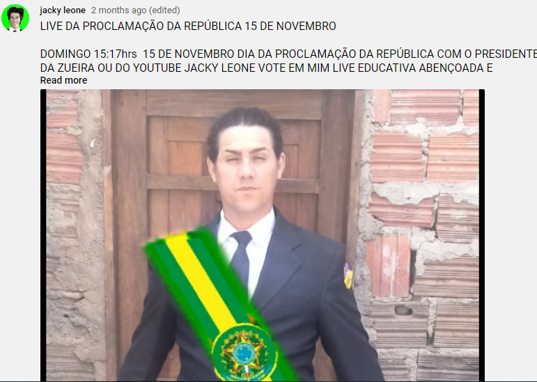 Jacky Leone é um famoso gari Pernambucano da cidade de São Caetano que ficou conhecido pelo seu lado humorístico com projetos caseiros onde interpretava personagens e lutava Kung Fu com sua aspiração em querer ser uma mistura de Jim Carrey com Jackie Chan , no começo dos anos 2010 acabou virando youtuber expandindo seus personagens para um público internauta com a ajuda dos seus filhos, em 2016 se candidatou para vereador e acabou sendo o mais eleito da história de São Caetano, porém Jacky não mudou o seu jeito de ser e acabou tretando com o prefeito do seu partido virando o palhaço da câmara de vereadores, 4 anos depois apesar de conseguir mais fama na internet a infâmia de Jacky fez com que não fosse reeleito, hoje em dia tenta falar de política de forma humorada enquanto continua interpretando seus personagens e reclamando da forma que o youtube piorou no período de uma década.
