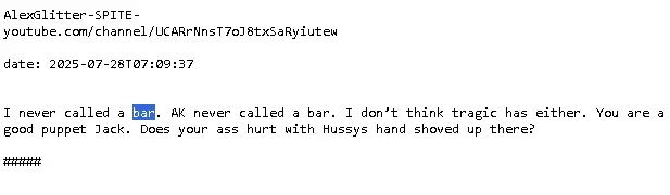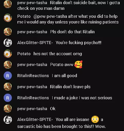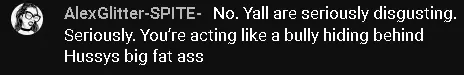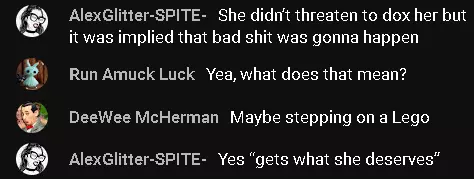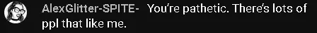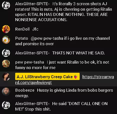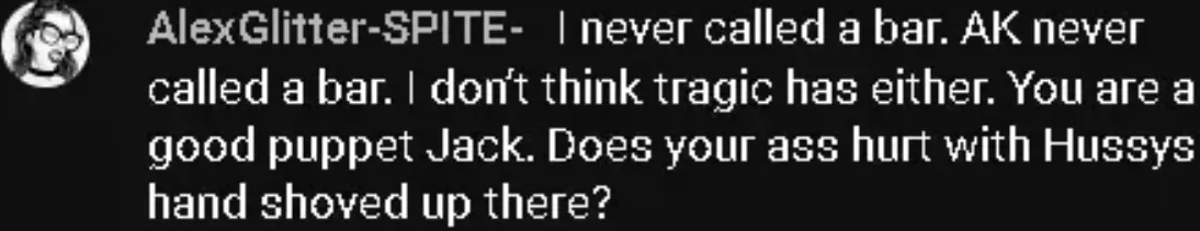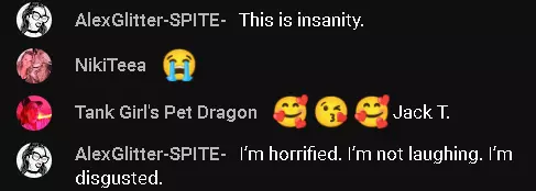 Here is a comment in the chat left by none other but Alex Glitter Queef. It made me laugh out loud.
