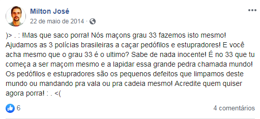 3. Tem alguma notícia dos agressores? Você chegou a mover alguma ação na justiça contra eles? O cara q eu mordi a orelha a mulher largou ele. E quando na época tentamos fazer a justiça agir. Não deu em nada. Os caras são da Assembléia d Deus. Os assembleianos mandam aqui na cidade. A justiça aqui só funciona pra poderosos ou amigo d poderosos. No caso os caras são amigos d poderosos q escondido nas Igrejas deram um jeito d abafar o caso. Os caras ficaram impunes. Mas é questão d tempo pra eles se lascarem feio agora q o vídeo está sendo divulgado do jeito q ta.