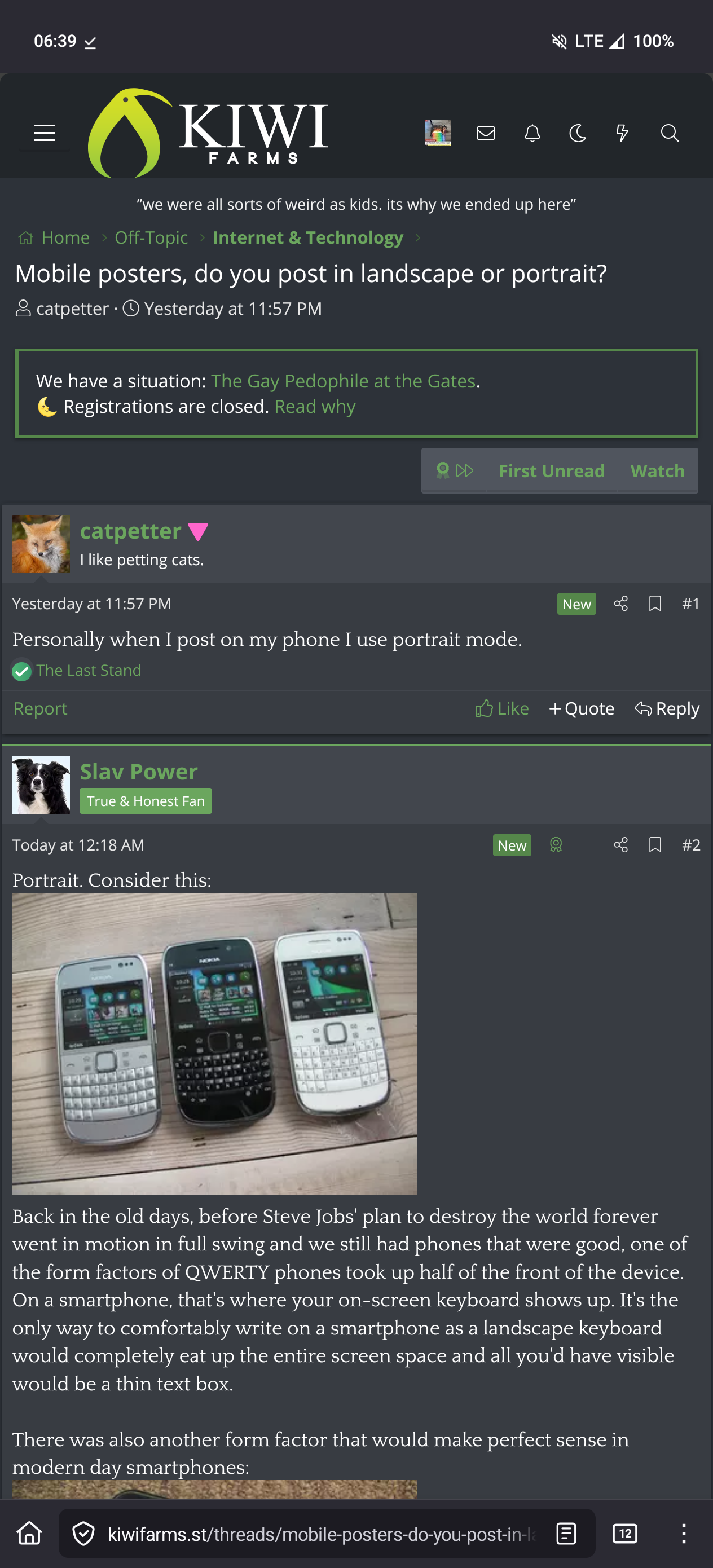 My favorite phone I've ever had was the Pantech Renue, the slide-out keyboard on that was great and it was the perfect little shitposting square. I like the quality of the camera on my current phone and wouldn't want to downgrade, but the internet was more fun when it was a struggle to navigate on mobile. I used to post on forums from the original Samsung Flight, THAT was a pain in the ass.A physical horizontal QWERTY keyboard that slides out. You have all the screen space of horizontal web browsing, and a horizontal physical keyboard which is the more natural form for it as that's how it was ever since the typewriter was invented.