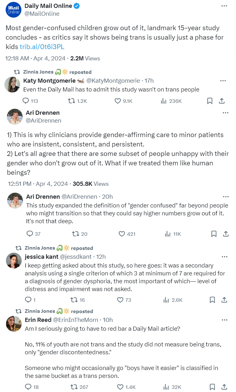 They always do these mental gymnastics to explain away any study with findings they don't like. I recall them screeching about the study in which the parents of trans/NB kids said that as soon as one kid in the friend group started identifying as genderspecial, the rest of the kids followed soon after, which would indicate a high degree of social contagion. "UHM, well ACKSHYALLY, they weren't asking the kids, but the bigoted parents, therefore the study is meaningless!!1!" If you indulge kids in this way, and let them do whatever they want, you're going to end up with loads of socially maladjusted adults. These fucking people, I swear to God...